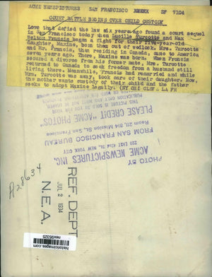 In San Francisco, Lucille Turcotte and Max Welton Francis began a fight for their five-year-old daughter, Maxine, born them out of wedlock. Mrs. Turcotte and Mr. Francis, then residing in Canada, came to America seven years ago. There, Maxine was born. When Francis secured a divorce from his former mate, Mrs. Turcotte returned to Canada to seek freedom from a husband still living there. Meanvwhile, Francis had remarried and while Mrs. Turcotte was away, took care of their daughter. Now, the mother wants custody of their child and the father seeks to adopt Maxine legally.