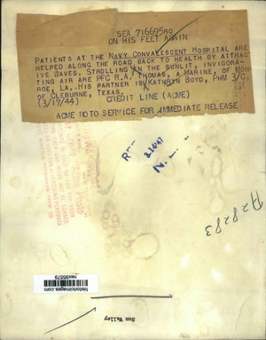 Patients at the Navy Convalescent Hospital are helped along the road back to health by attractive Waves. Strolling in the sunlit air are Private First Class R.A. Thomas, a Marine, of Monroe, Louisiana. His partner is Kathryn Boyd, PHM 3/C of Cleburne, Texas.