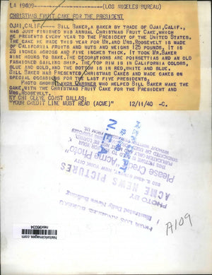 1940 Press Photo Christmas Fruitcake for President of US by Bill Baker