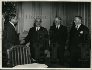 Blum, at left, shakes hands with Albert Sarraut, while two new ministers look on. At extreme right is R. Salengro, new Minister of the Interior who finds himself at the commencement of his job with the difficult task of settling the prevalent and dangerous strike situation. Next to Salengro is M. Lebas, new Labor Minister.