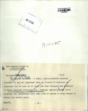 A small, easily-handled airborne recorder to log all important data on flights of missiles or airplanes for as long as 10 hours has been designed and produced by North American Aviation, Inc. Company employee Patsy Scott displays the lightweight unit that bids to become a vital factor in making air travel safer.