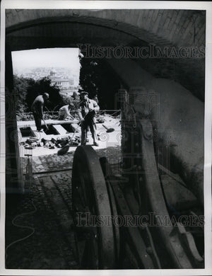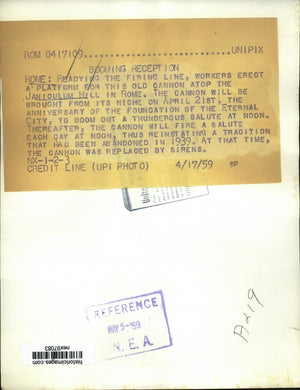 Readying the firing line, workers erect a platform for this old cannon atop the Janiculum Hill in Rome. The cannon will be brought from its niche on April 21st, the anniversary of the foundation of the Eternal City, to boom out a thunderous salute at noon. Thereafter, the cannon will fire a salute each day at noon, thus reinstating a tradition that had been abandoned in 1939. At that time, the cannon was replaced by sirens.