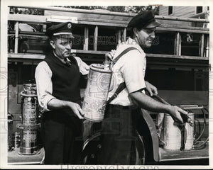 1941 Press Photo Fire Chief Ted Kekic Jr Straps Indian Fire Fighter on Brother