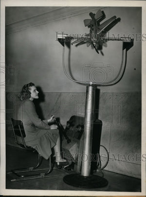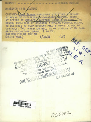 1946 Press Photo Jean Trinka & mini plane at World Invention Expo Chicago