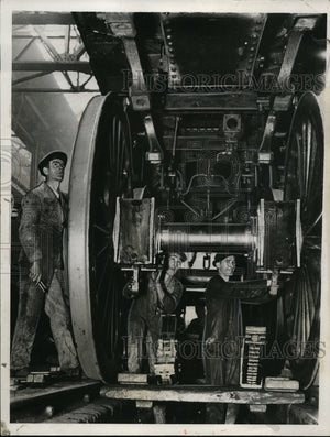 As part of a new speeding-up campaign, a new fleet of super-express locomotives are being constructed in the works of the Southern Railway in Eastlei~ Hampshire, England. Shown are workmen fitting springs on one of the new rail giants.