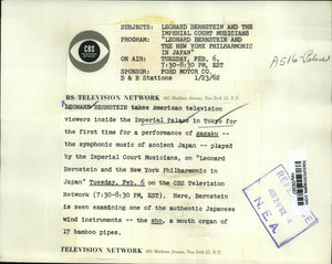 He is there for a performance of gagaku, the symphonic music of ancient Japan, for "Leonard Bernstein and the New York Philharmonic in Japan"