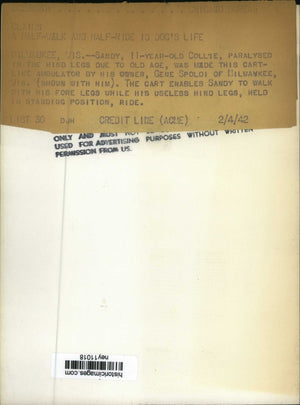 1943 Press Photo Sandy 11 Year Old Collie Paralyzed Uses Cart Made by Gene Spold
