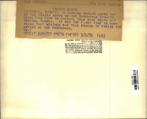 1954 Press Photo Turkish Sailor Looking Out Over Frozen Waves, Bosphorus Straits