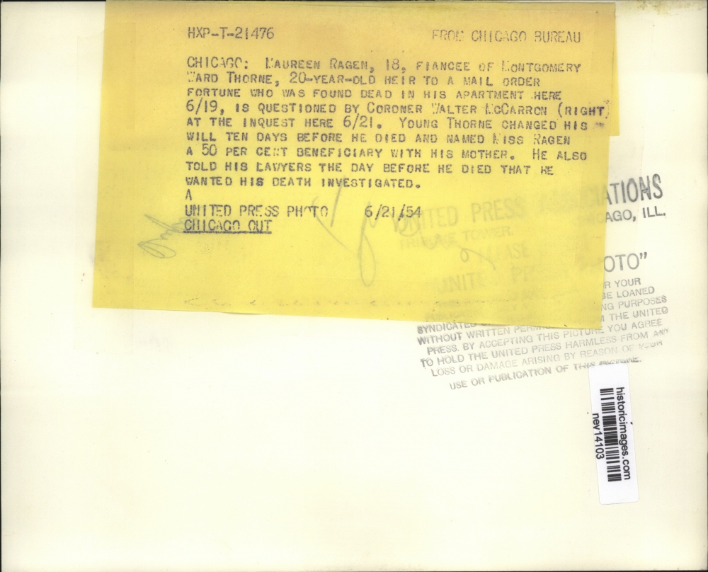 1954 Press Photo Maureen Ragen questioned for Montgomery Ward Throne slaying