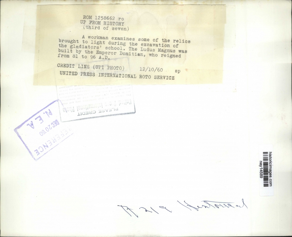 1960 Press Photo Workmen examined relic brought excavation of Gladiators School