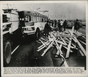 1949 Press Photo Loaded San Francisco Bus Collides with Lumber Trucks