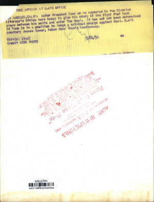 Shown with D.A.'s secretary Joanne Spear, who took down his testimony. He gave his story of the fight that took place between him self and actor Tom Neal. It has not been determined if Tone is in a position to lodge a criminal charge against Neal.