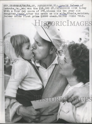 1958 Press Photo Arnold Palmer kisses his two-year-old daughter, Peggy