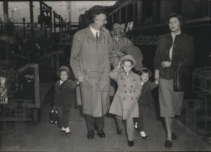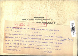 Ingrid Bergman with her children Ingrid, Roberto and Isabelle, accompanied by a friend (unidentified) and followed by the nurse as she alighted from the Orient Express coming from Rome this morning. She is to star a new film produced by Jean Renoir "Oeillet Rouge" (Red Carnation) based on the story of General Boulanger's life.