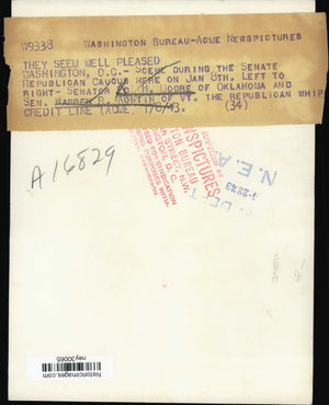 Scene during the Senate Republican Caucus here on Jan. 8th left to right - Senator Ed H Moore of OK and Senator Warren R Austin of VT the republican whip.