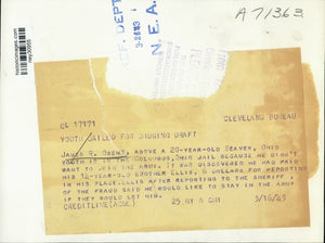 James R Owens, 20 year old Beaver, Ohio youth is in the Columbus, Ohio jail because he didn't want to join the Army. It was discovered he had paid his 14 year old brother, Ellis, $6 for reporting in his place. Ellis, after reporting to the Sheriff of the fraud, said he would like to stay in the Army if they would let him.