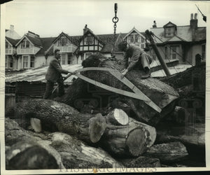 Upham (L) measures an elbow-shaped oak trunk that is to be used for rounded parts of the new "Mayflower." Sawman Frederick Butt lends a hand. The replica's keel was laid last July.