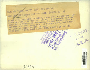 1939 Press Photo Lifebelt Expands Once Button Pushed Brings Bather to Surface
