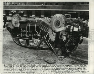 Badly buckled, and with its front end smashed flat, an old car shows the effects of being dropped to the pavement from a height of 53-feet--the equivalent of smashing into a solid well at a speed of 40mph--in a demonstration aimed at Labor Day weekend drivers. A University of Minnesota Professor, James J. Ryan, working on ways to reduce impact effects of car collisions gave the public demonstration while gathering data for his work.