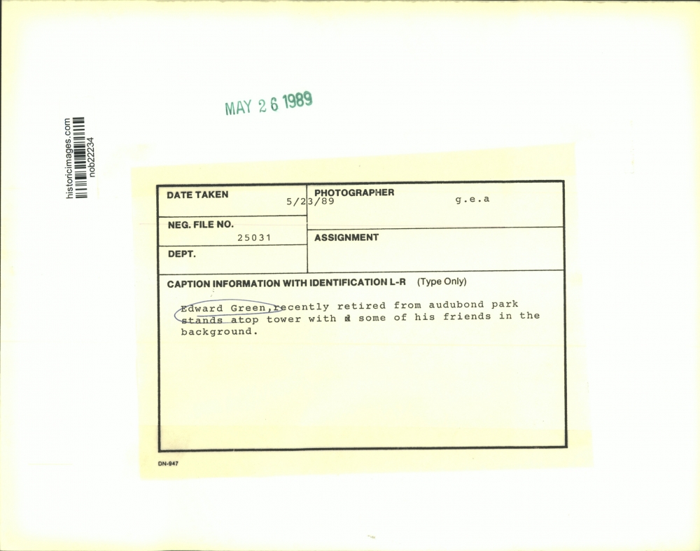 Edward Green, recently retired from Audubon Park stands atop tower with some of his friends in the background.