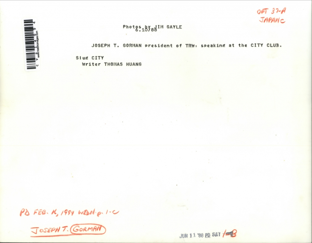 1988 Press Photo Joseph Gorman President of TRW speak at the City Club