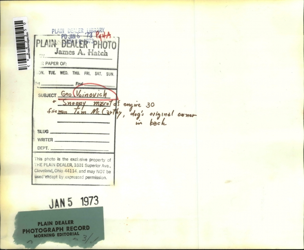Fireman Tom McCarthy and Mascot Snoopy of engine 30 and the dogs Original Owner In the back