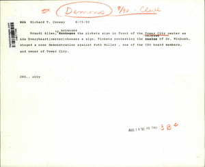 Brandi Allen, 12, arranges the pickets sign in front of the Tower City center as Ada Everyheart 9center) chooses a sign. Pickets protesting the release of Dr. Winbush, staged a noon demonstration against Ruth Miller, one of the CSU board members, and owner of Tower City.
