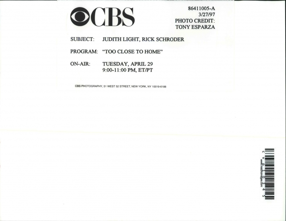 Judith Light & Rick Schroder in Too Close to Home Photo measures 9 x 7 inches. Photo is dated 3-27-1997.