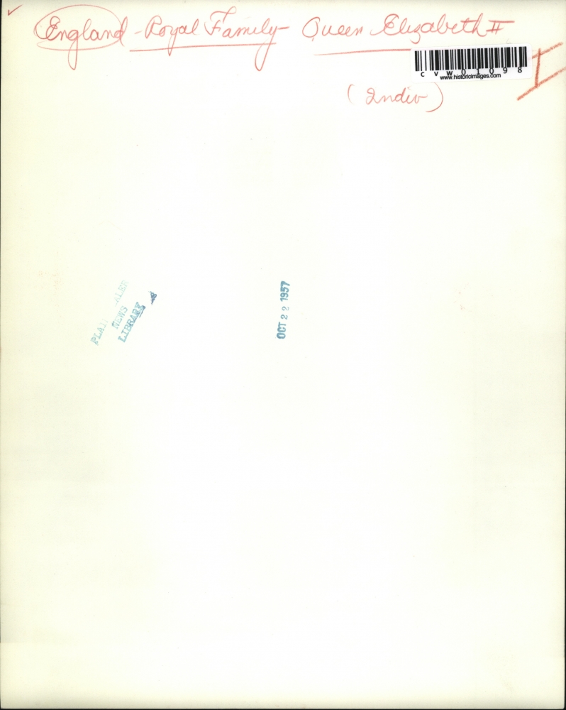 with a winsome smile Queen Elizabeth poses at the rear of her special train last night just prior to its departure for New York. Vice President and Mrs, Richard Nixon were among the Approximately 1,500 persons who came to say goodbye to the Queen and her husband Prince Philip. The Royal Pair were guest of Pres. eisenhower at the White House during their fourth day visit. Photo measures 8.25 x 10.25 inches. Photo is dated 10-21-1957.