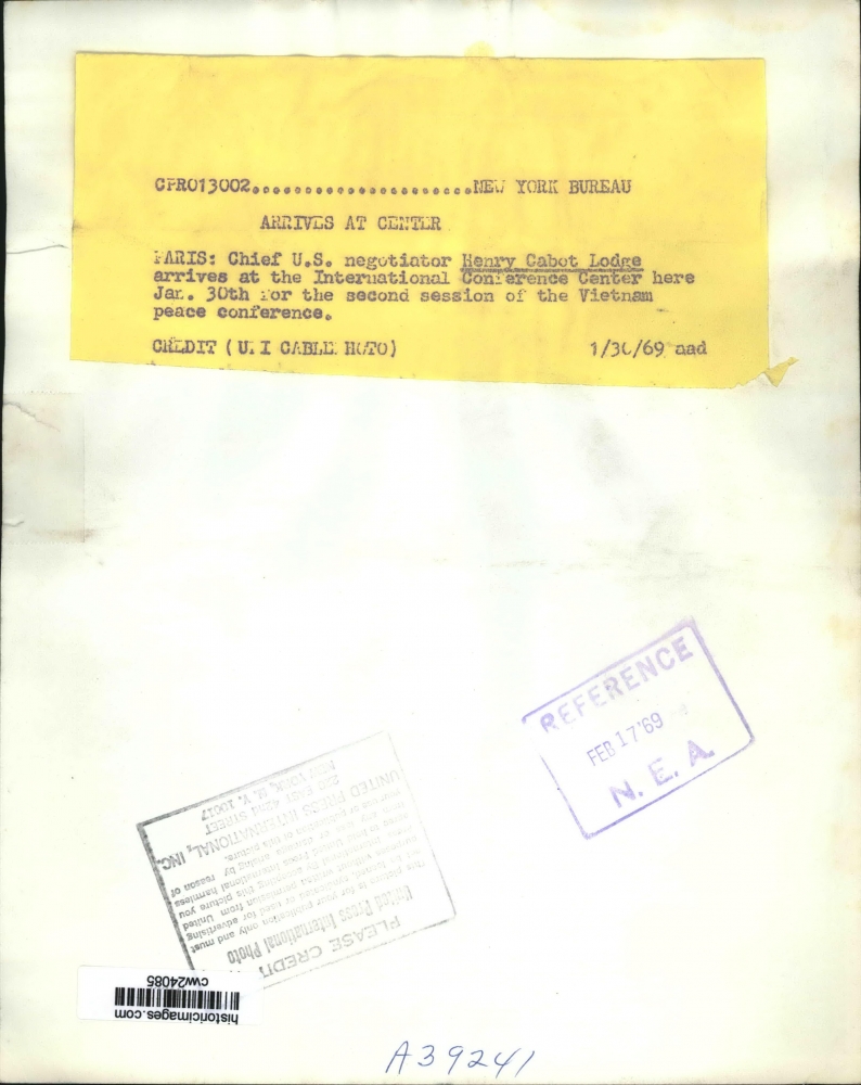 Paris--Chief US negotiator Henry Gabot Lodge arrives at the International Conference Center here Jan. 30th for the second session of the Vietnam peace…