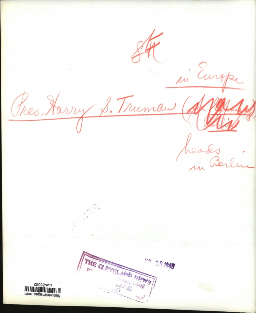 President Truman smiles today just after his arrival at Galow Airport here for the "Big Three" Conference in suburban Potsdam. At right is his Military Aide, Brig. Gen. Harry Vaughan.