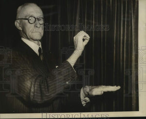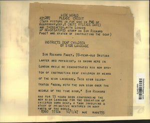 Instructs deaf children by sign language...Sir Richard Paget, 78-year-old British lawyer and physicist, is shown here in London while he demonstrates his new system of instructing deaf children by means of the sign language. This sign illustrates "noon, with the sun sign over the middle of the tie sign." Sir Richard has for 13 years been compounding the new sign language for the education of children born dear, a task involving a study of primitive gestures in many parts of the world (London) (Sign Language) (Children) (Deaf Children) (Lawyers) (Physicist)