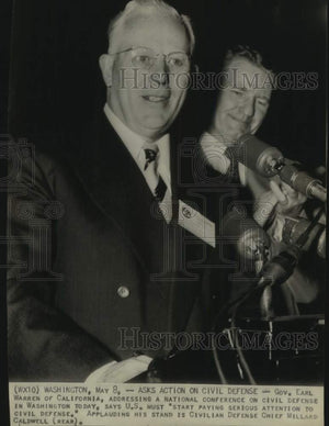 Washington -- Asks action on civil defense -- Governor Earl Warren of California, addressing a National Conference on civil defense in Washington today, says United States must "start paying serious attention to civil defense." Applauding his stand is Civilian Defense Chief Millard Caldwell (Washington)