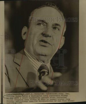 Washington -- Threatens injunction -- Attorney General William Saxbe tells a Washington news conference Friday he may seek a court injunction against state lotteries unless Congress acts within 90 days to exempt states from federal antilotttery laws. (Washington)