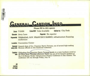 General shots of Governor Francisco Barrio Terrazas, one of several high-ranking Mexican officials at this binational conference. Chihuahua Governor Francisco Barrio Terrazas speaks to a noon luncheon crowd at the River Room Thursday afternoon. Barrio was one of two keynote speakers at the U.S./Mexico Border Infrastructure Finance Conference in San Antonio. The conference will run through Friday, July 15.