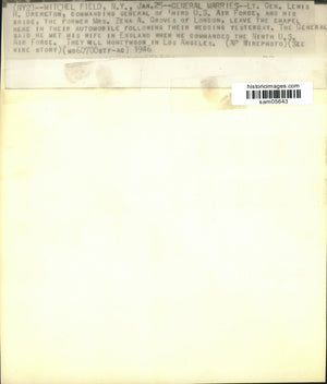 Mitchel Field, New York: Lieutenant General Lewis R. Brereton, commanding general of third U.S. Air Force, and his bride, the former Mrs. Zena A. Groves of London, leave the chapel here in their automobile following their wedding yesterday. The General Air Force. They will honeymoon in Los Angeles.
