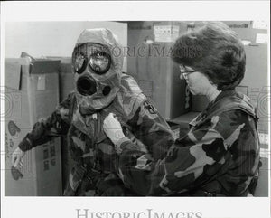 1990 Press Photo Maj. Chris De Stefon & Lt. Mary Menard with chemical masks, TX