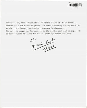 Middle East Crisis ---- Major Chris De Stefon helps Lt. Mary Menard practice with the chemical protective masks Wednesday during training at the 114th Evacuation Hospital Reserve headquarters. The unit is preparing for service in the Middle East and is expected to leave within the next two weeks (Texas)