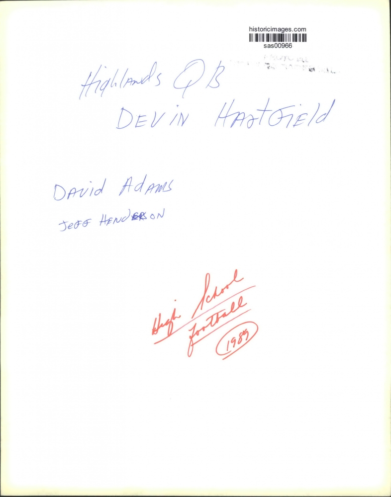 Highlands quarterback Devin Hartfield; David Adams, Jeff Henderson; high school football 1989