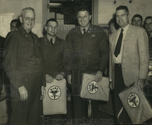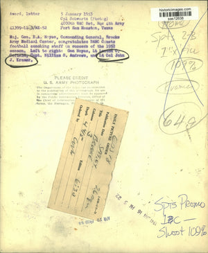 Major General E. A. Noyas, Commanding General, Brooke Army Medical Center, congratulates BAMC Comets football coaching staff on success of the 1952 season. Left to right: Gen Noyes, Lt. Leston C. Cofield, Capt. William S. Andrews, and Lt. Col. John J. Kramer