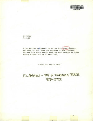 1990 Press Photo F.L. Button prepares to raise his flag at home on Formosa Place