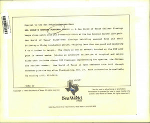 Special to the San Antonio Express-News --- Sea World's Growing Flamingo Family -- A Sea World of Texas Chilean flamingo keeps close watch over its 3-week-year-old chick at the San Antonio marine life park. Sea World of Texas' first-ever flamingo hatchling emerged from its shell following a 30-day incubation period, weighing less than open pound and measuring 4 to 6 inches in height. The chick is one of several hatched at the 250-acre park in recent weeks, joining an extensive collection of tropical and native birds that includes almost 100 flamingos representing two species, the Chilean and African Lesser. Sea World of Texas is open weekends this fall through November plus the day after Thanksgiving, November 27. More information is available by calling (512) 523-3611.