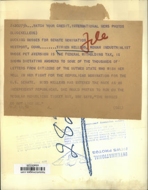 Vivient Kellems, Woman Industrialist whose pet aversion is the Federal Withholding tax, is shown dictating answers to some of the thousands of letters from citizens of the nutmeg state who wish her well in her fight for the Republic Nomination for the U.S. Senate. Miss Kellems has enters the race an an independent republican. She would prefer to run on the regular republican ticket but, she says, "The Bosses do not like me."