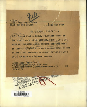 J.O. Dumas, Pampa, Texas, Policeman talks in the county jail in Bridgeport, Conn. ,June 28, with his daughter, Mrs. Imogene Stevens, held in lieu of $50,000 bail on a manslaughter charge in the fatal shooting of Albert Kovacs on June 23, a 19 year old Norwalk sailor.