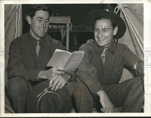 Michael Phipps (L), sportsman, reads paragraphs from the "Basic Field Manual" to Alexander McFadden, efficiency expert, July 6 at Plattsburg, NY, where 500 business and professional men started military training. The special military course, given by the regular army, was open to men 25 to 50 years of age. Each trainee pays his own transportation and expense