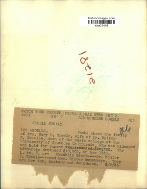 The family of Mrs Mary B Skeele wife of Dr Walter Skeeles dean of music college at USC who waass kidnapped and held for ransom The kidnappers demanded $10,000 of her life L to R are FranklinSkeele--Dr Walter F Skeele-- and Mrs Walter Humphreys They are her son, husband and daughter