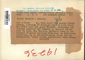 No this isnt Sir Austin Chamberlain although it would be hard to tell which were the great British Statesman and Foreign Minister and Francis A Russell placed side by side. Mr Russell pictured here on the steamer Calawaii arriving from home in Melbourne Australia. He is internationally known for his innumerable shirt sleeve interviews with Kings.