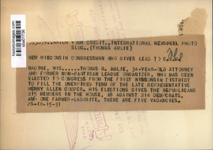 Thomas R. Amlie, 34, Attorney and former Non-Partisan League Organizer, has been elected to Congress from the First Wisconsin District to fill the unexpired term of the late Rep. Henry Allen Cooper. His elections gives the Republicans 215 members in the House. There are 5 vacancies.
