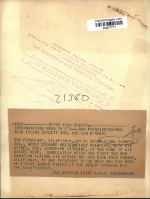 Young Corbett 3rd, newly Crowned Welterweight Champion, with his Mother, Mrs. Josephine Giordano, at the home of his Sister's.