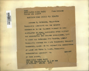 Raymond S. McKeough, Kelly-Nash Democratic candidate for the Senator Nomination in the Illinois Primary is congratulated by other candidates after victory was assured for the Chicago Congressman. left to right are McKeough, Don Forsyth, likely Democratic Nominee for State Treasurer, Benjamin Adamowski, Leader in the primary for Congressman at large and Peter B. Carey, Democratic Organization for Cook Country.